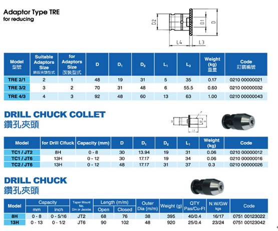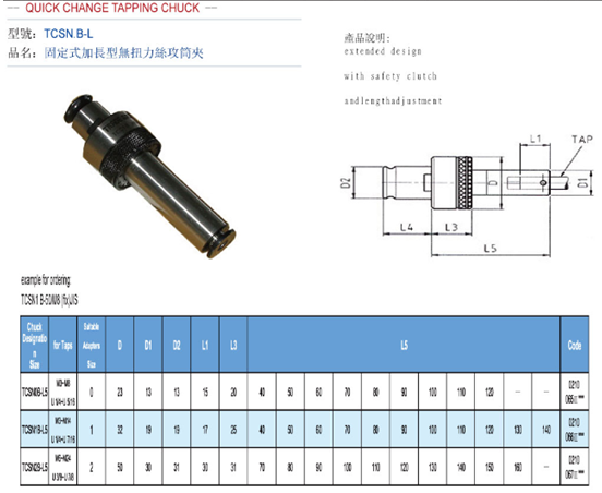 產品描述:無扭力絲攻筒夾:TC.B 安全扭力絲攻筒夾:TCS.B 固定式無扭力絲攻筒夾:TCS.B(fix) 固定式加長型無扭力絲攻筒夾:TCN.B-L 過渡套/轉換頭:TRE ER型絲攻筒夾:TC/ER 丸駒型絲攻筒夾:TC/SCH