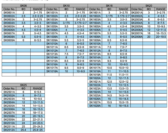 • 產(chǎn)品描述:SK筒夾系列: A級: 1.HRC : 47° 2.CLAMPING RANGE : D1 below 3mm is 0.25mm. D1 over 3mm is 0.5mm.(A class only) AA級: 1.HRC : 47° 2.CLAMPING RANGE : D1 below 3mm is 0.25mm. D1 over 3mm is 0.5mm.(A class