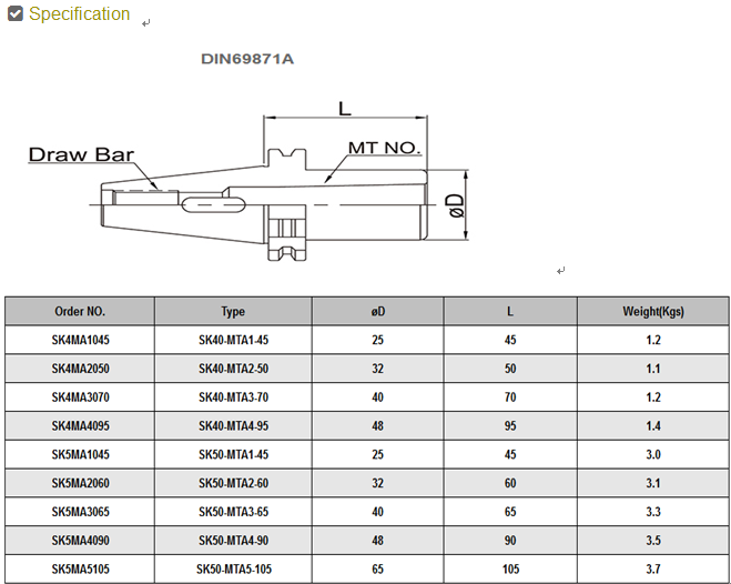• Product description: SK/MTA MORSE TAPER ADAPTOR:Draw Bar:SK40→M16 x 2.0P,SK50→M24 x 3.0P